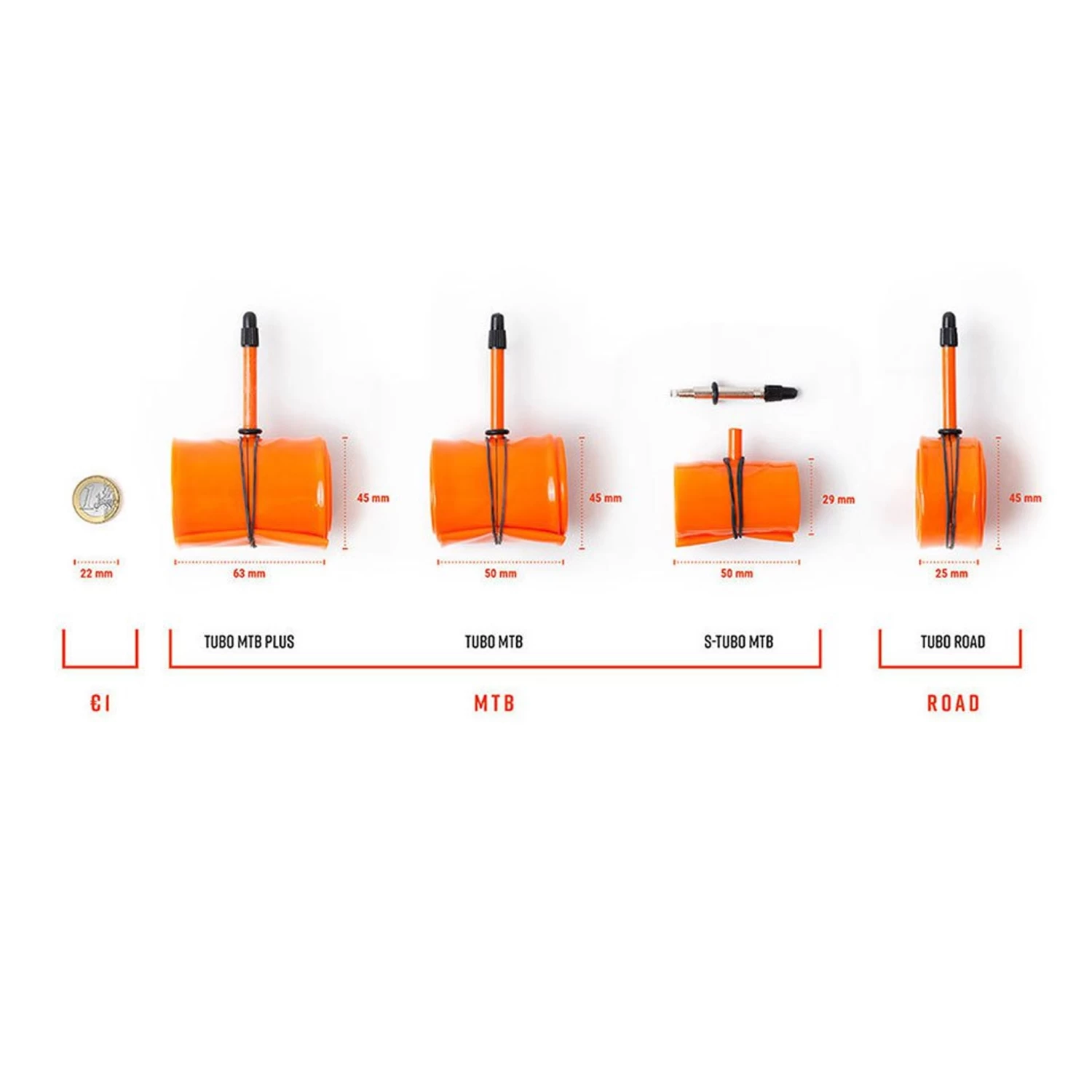 La chambre à air MTB+ Tubolito se monte exclusivement sur des vélos ayant des freins à disque en raison de la faible matière qui compose la chambre à air et qui pourrait surchauffer avec des freins à patins. Elle pèse 105 grammes en 27.5 pouces et 115 grammes en 29 pouces.