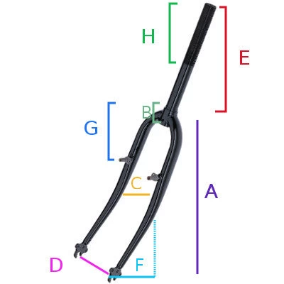 | A / longueur jambage | B / hauteur du té | C / Largeur intérieur jambage | D / Entraxe | E / Longueur du pivot | F / Angle ou déport de la fourche | G / Hauteur fixation étriers | H/ hauteur filetage | |