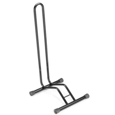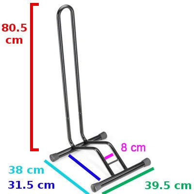 Ce support se met au sol et dispose de 4 bouchons en plastique ce qui préserve la surface du sol et évite au râtelier de glisser. Pesant 3 kilos, il a pour dimensions : 39.5 x 38 x 80.5 cm. L’espace pour accueillir la roue mesure 80 mm.